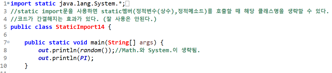 java.lang.System.*을 import했기 때문에 System.out.println(Math.random());을 out.println(random())으로 작성할 수 있다.