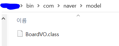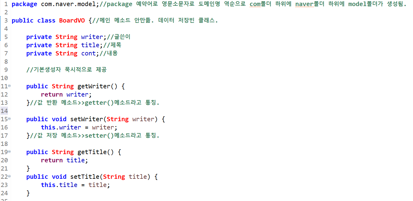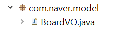 com.naver.model 패키지의 BoardVO 클래스를 작성했다. 보통 해당 클래스를 데이터 저장을 위한 빈클래스라고 한다. 멤버변수가 private로 되어있기 때문에 setter, getter로 값을 저장하고 리턴해준다.
