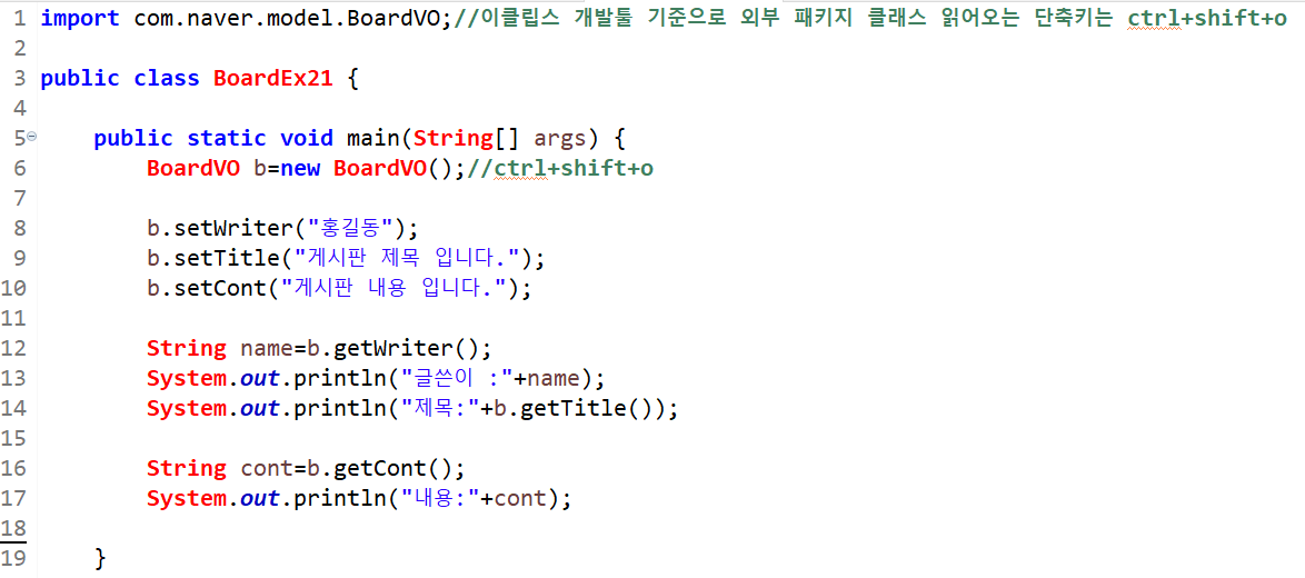 다른 패키지에서 com.naver.model.BoardVO패키지를 import해주고 BoardVO클래스 객체를 생성해서 멤버변수를 초기화하고 출력하는 과정이다.