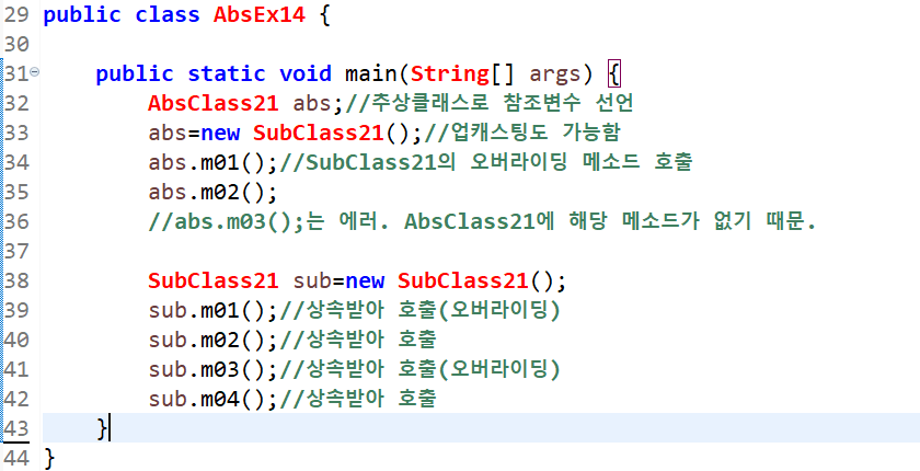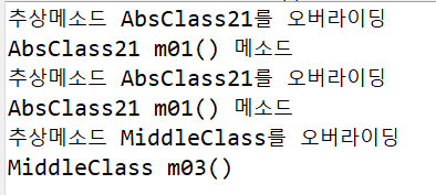 추상메소드는 선언부만 작성하고 구현부는 작성하지 않은 채로 남겨 둔 것이 추상메소드이다. 메소드를 미완성 상태로 남겨놓는 이유는 메소드의 내용이 상속받는 클래스에 따라 달라질 수 있기 때문에 조상클래스에서는 선언부만 작성하고, 주석을 덧붙여 어떤 기능을 수행할 목적으로 작성되었는지 알려주고, 실제내용은 상속받는 클래스에서 구현하도록 비워두는 것이다.