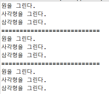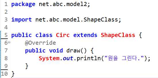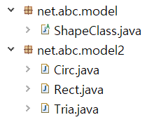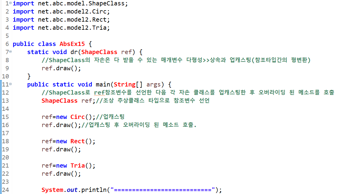 해당 패키지의 클래스들을 import했기 때문에 ShapeClass 및 Circ, Rect, Tria 클래스들을 사용할 수 있다. 첫 번째는 ShapeClass타입 ref참조변수를 선언해 각 도형(Circ, Rect, Tria)인스턴스 들을 생성해 업캐스팅한 후, draw()메소드를 호출하면 각 클래스에 맞게 오버라이딩 된 함수가 호출된다.
