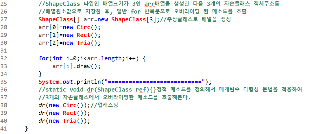 두 번째는 ShapeClass타입의 추상클래스 배열을 생성해 각 배열에 도형 인스턴스들을 대입해 각 배열마다 draw()메소드를 호출해 각 클래스에 맞는 오버라이딩 된 함수가 호출된다.(arr[0]=new Circ();에서 업캐스팅 된다.)
