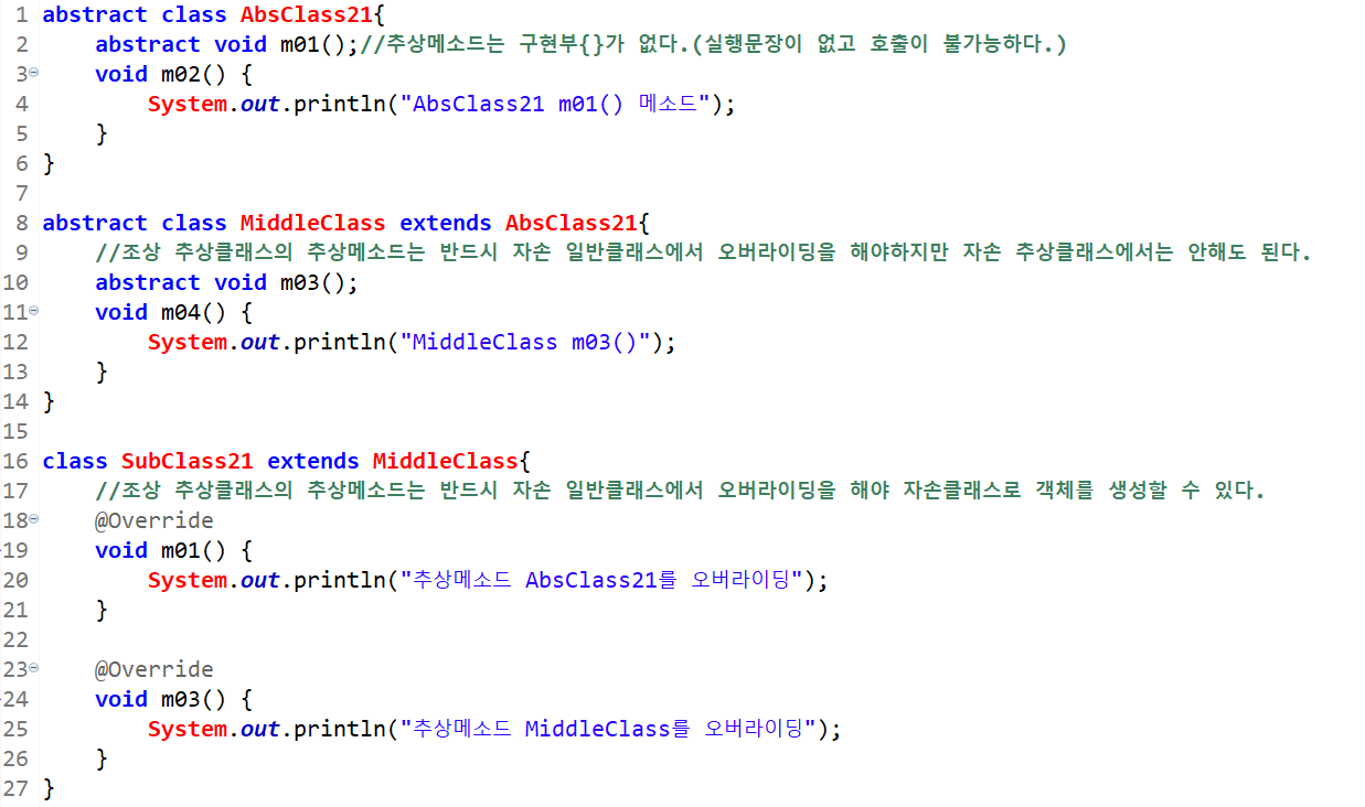 추상메소드 키워드는 "abstract"을 붙이면 된다. 그리고 구현부가 없으므로 괄호{}대신 세미콜론(;)을 적어준다. 추상클래스로부터 상속받는 자손일반클래스는 오버라이딩을 통해 조상인 추상클래스의 추상메소드를 모두 구현해주어야 한다. 만일 조상으로부터 상속받은 추상메소드 중 하나라도 구현하지 않는다면, 자손클래스 역시 추상클래스로 지정해주어야 한다. 만약 추상클래스가 추상클래스를 상속받는다면 오버라이딩 할 필요가 없다.