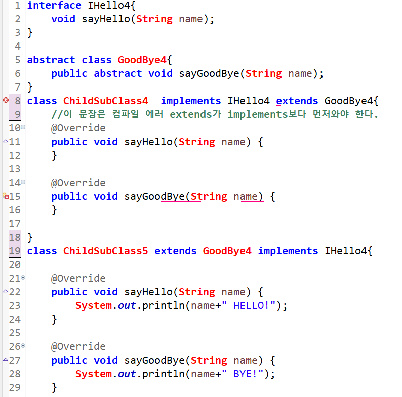 인터페이스 구현 및 클래스를 상속을 같이 받으려면, extends 클래스를 먼저 작성한 후 implements 인터페이스를 해야한다. 반대가 되면 에러가 발생한다.