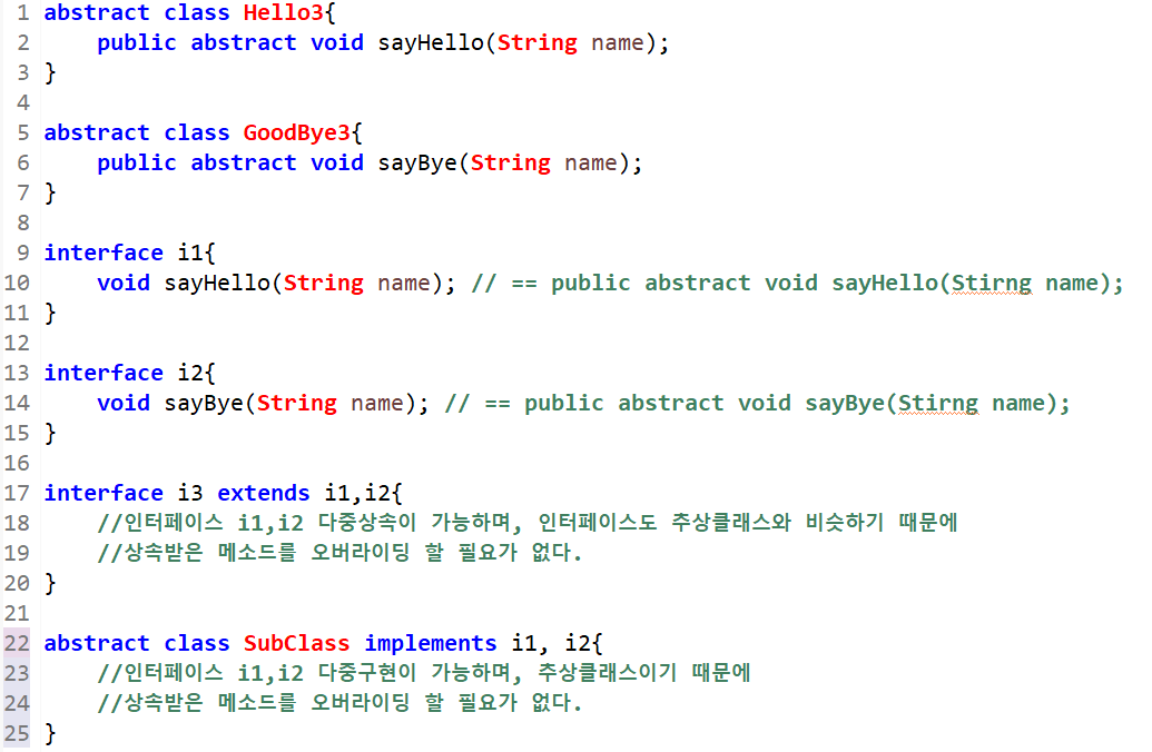 - 하나 이상의 부모로부터 다중상속이 가능하다.(interface extends interface2, interface3,...) 인터페이스도 추상클래스와 비슷하기 때문에, 자식인터페이스에서 오버라이딩 할 필요가 없다.