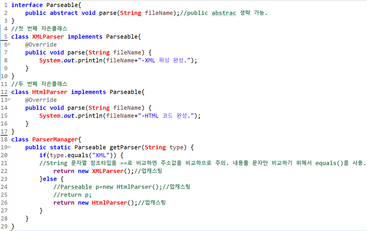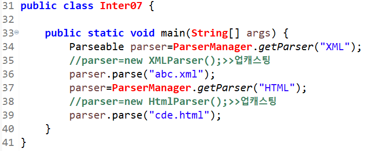 참조변수 parser에 ParserManager.getParser()메소드를 호출하고 매개변수를 "XML"으로 한다. 여기서 해당 메소드에서 if조건문에 걸려 new XMLParser();가 리턴되므로 해당 문장은 parser=new XMLParser();(업캐스팅)으로 볼 수 있다. 여기서 parser.parse("abc.xml")를 호출하면 XMLParser에서 오버라이딩 된 parse()메소드가 호출된다.