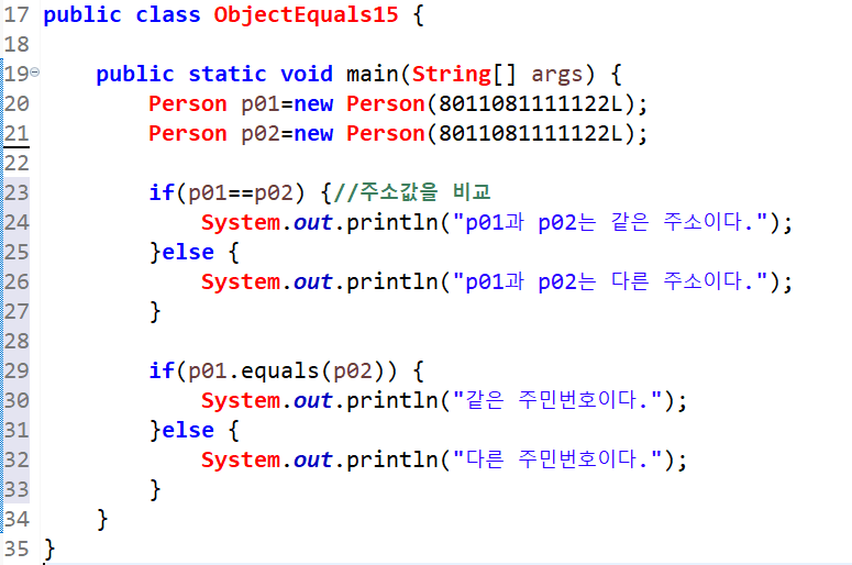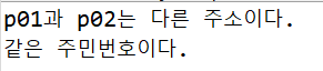 Person 타입의 p01과 p02객체를 생성하는데, new연산자로 생성하므로 두 객체의 주소는 서로 다르다. 그래서 p01==p02로 비교하게 되면 주소값을 비교하므로 두 객체주소가 다르다라고 출력된다.