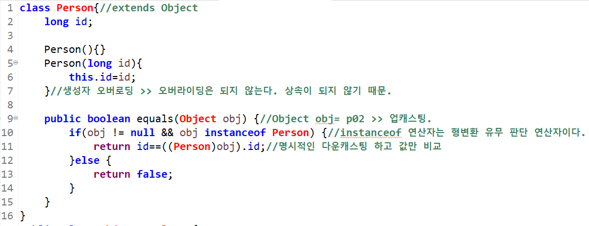 두 번째 조건인 p01.equals(p02)는 오버라이딩한 equals()메소드에서 매개변수가 Object obj로 Object obj=p02;로 업캐스팅 되었다가 if조건문에서 Person으로 다운캐스팅 할수 있는지 instanceof로 판단되고, 다운캐스팅 가능하다 판단이 되면 p01의 id와 (Person)p02로 다운캐스팅해 Person의 id와 값을 비교하고 일치하면 true를 리턴한다.