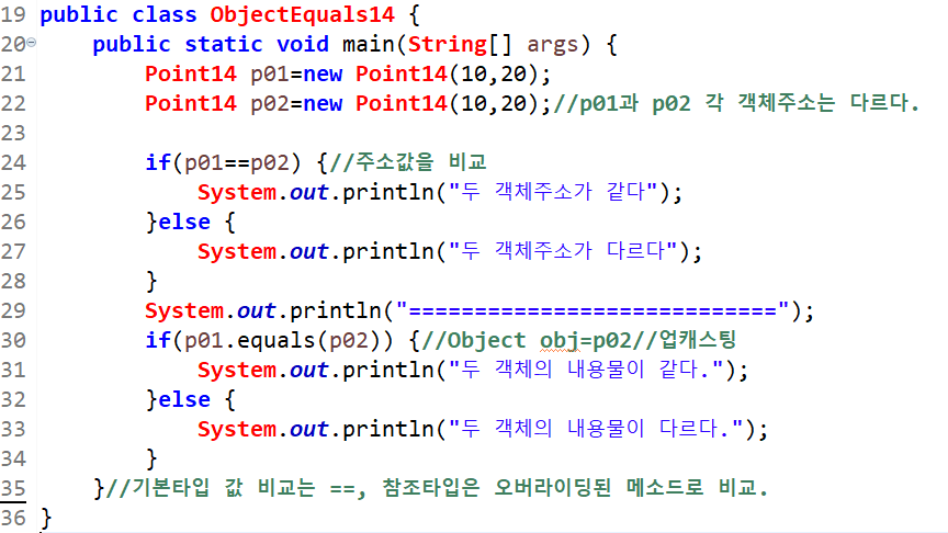 Point14 타입의 p01과 p02객체를 생성하는데, new연산자로 생성하므로 두 객체의 주소는 서로 다르다. 그래서 p01==p02로 비교하게 되면 주소값을 비교하므로 두 객체주소가 다르다라고 출력된다.