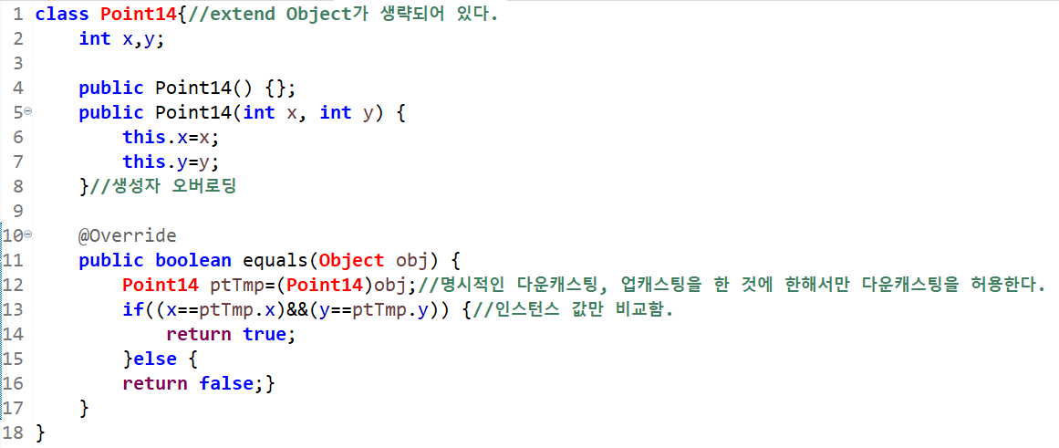 두 번째 조건인 p01.equals(p02)는 오버라이딩한 equals()메소드에서 매개변수가 Object obj로 Point14의 멤버변수 x와 y를 참조하기 위해서는 다운캐스팅 형변환을 해줘야 한다. 그래서 if조건문에서 p01의 x,y와 p02의 x,y 값을 비교하고 일치하면 true를 리턴한다.