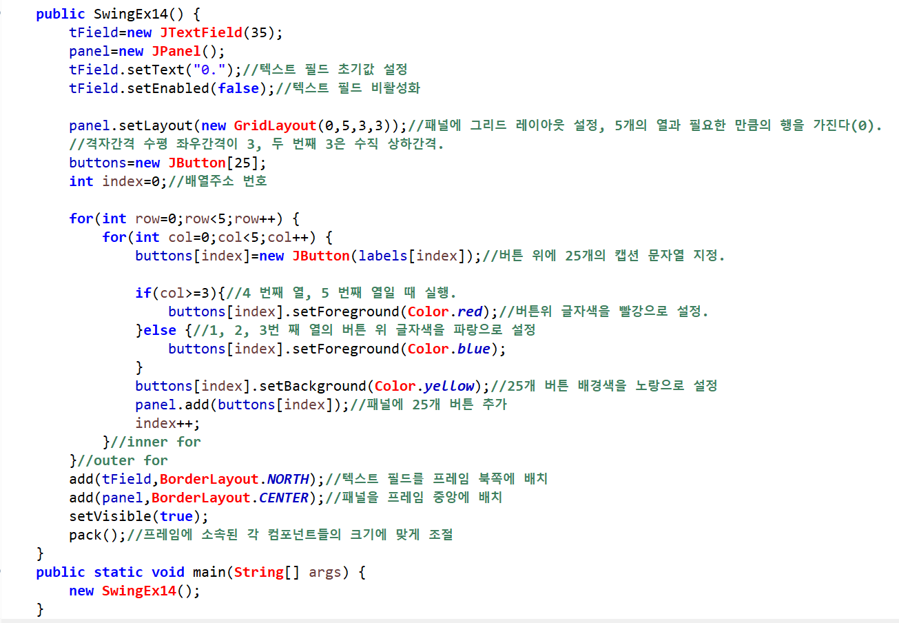그리고 panel의 배치관리자로 GridLayout을 사용해 0 필요한 만큼의 행과 5열로, 수평 좌우관격이 3, 수직 상하간격이 3으로 배치하게 만든다. 버튼은 배열로 지정해서, 이중 for문으로 각 버튼 인덱스와 라벨 인덱스가 같으면 대입하게 하고, 각 열마다 글자색과 전체 버튼의 배경색을 노랑색으로 설정해주고 panel에 추가해준다.
