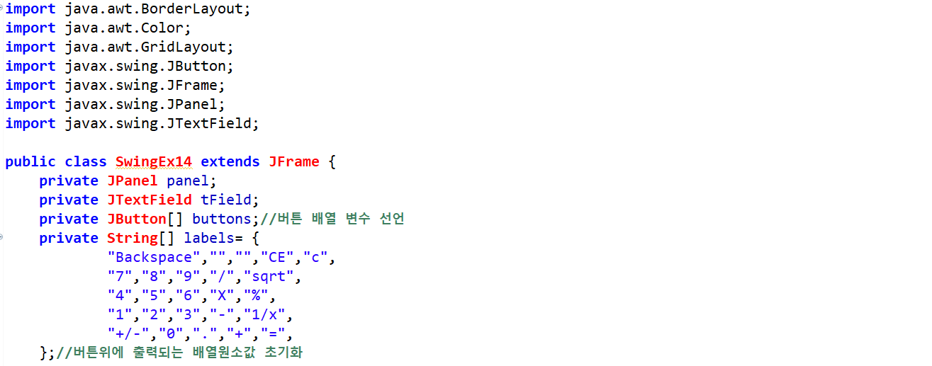 스윙으로 계산기 프레임을 만드는 코드이다. tField에 텍스트 필드 초기값을 설정하고, 입력 비활성화를 한다.