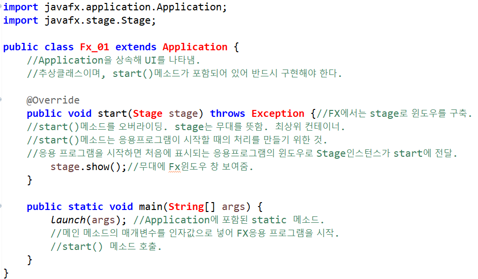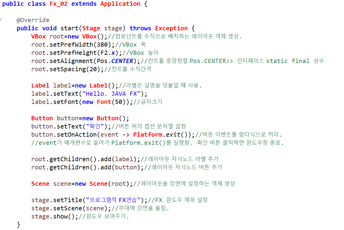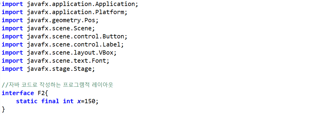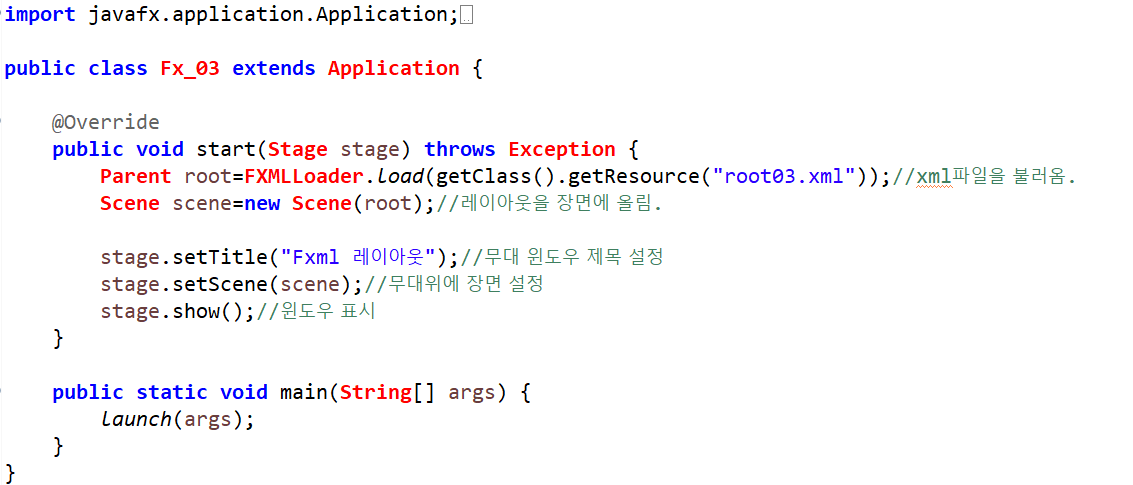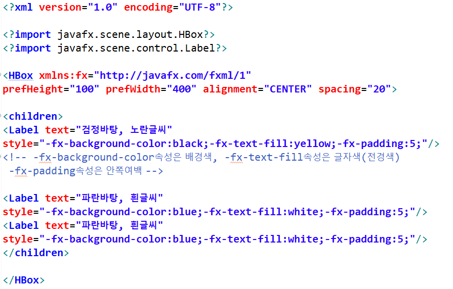 2. FXML로 작성하는 레이아웃 방법이다. FXML은 XML 기반의 언어로 UI 레이아웃을 자바코드에서 분리해서 태그로 작성한다. FXML 태그로 레이아웃을 정의하기 때문에 태그에 익숙한 디자이너와 협업이 가능하다. 또한 개발이 완료 된 후 간단한 레이아웃 변경도 쉽게 할 수 있다.
