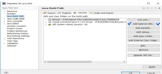 2. 프로젝트 속성 (프로젝트 선택 후에 우클릭-속성 혹은 alt+enter)에서 Java Build Path-Libraries-Add External JARs를 선택후 JAVA FX라이브러리 jfxrt.jar를 추가한다.