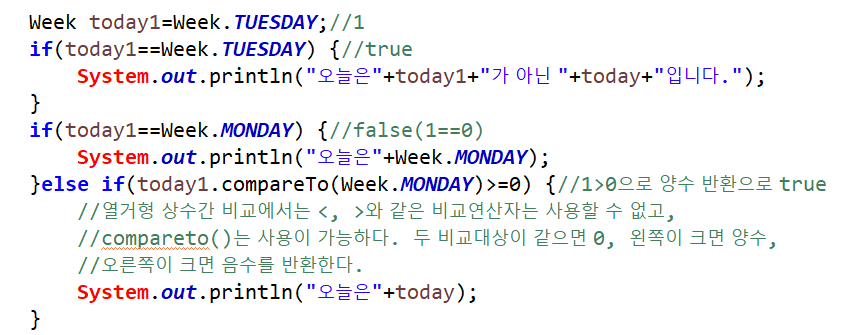 열거형 상수간의 비교에는 '=='를 사용할 수 있다. 그러나 >, <와 같은 비교연산자는 사용할 수 없고 compareTo()는 사용가능하다. 열거형에서는 먼저 선언된 상수에 0부터 시작하는 정수값이 할당된다.