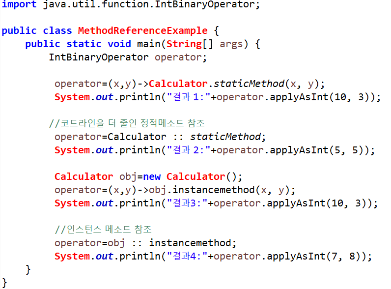 함수형 인터페이스인 Calculator는 리턴타입 int의 applyAsInt(int left, int left) 추상메소드가 있다. 여기에 람다식으로 객체를 생성할 수 있지만, 더 간단하게 메소드 참조로 객체를 생성할 수 있다.