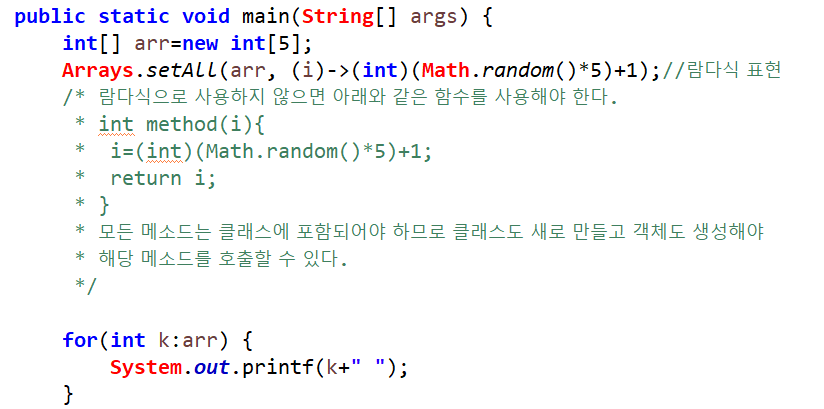 람다식은 오직 람다식 자체만으로 메소드의 역할을 대신할 수 있다.