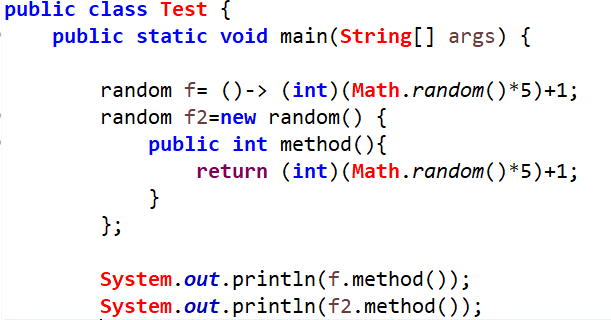 아래의 random 인터페이스에는 리턴타입이 int 인 추상메소드 method()가 정의되어 있다. 그리고 Test클래스에서 random인터페이스 타입 참조변수 f에 아래와 같이 익명객체 대신 람다식으로 대체해 대입할 수 있다. 왜냐하면 람다식도 실제로는 익명 객체이고, random인터페이스를 구현한 익명 객체의 메소드 method()와 람다식의 매개변수의 타입과 개수 그리고 반환값이 일치하기 때문이다. 이렇게 람다식을 다루기 위한 인터페이스를 "함수형 인터페이스(Functional Interface)"라고 한다.