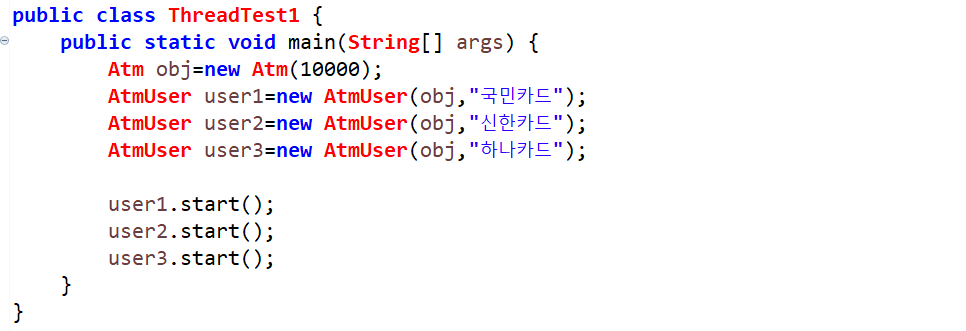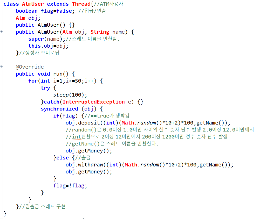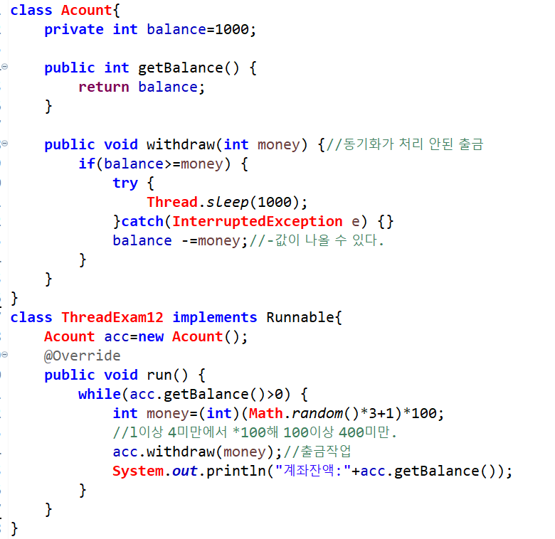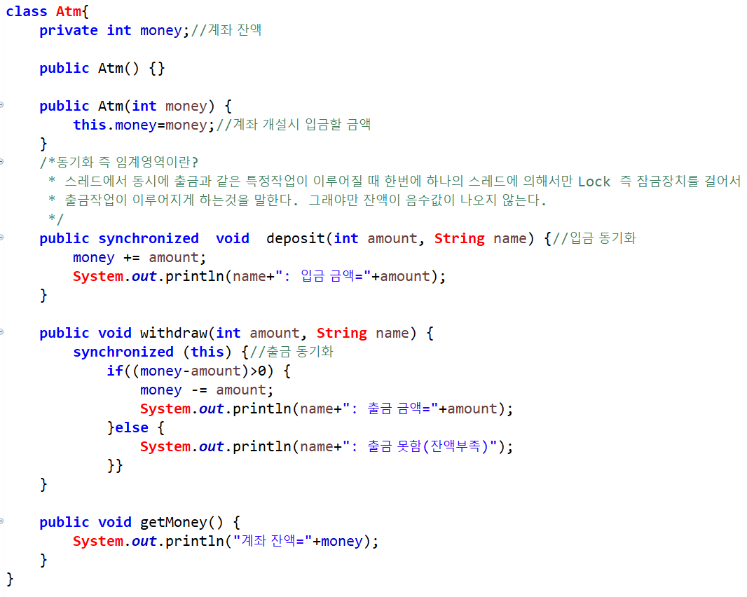 출금 메소드를 동기화 하지 않으면 A쓰레드가 작업하던 도중 B쓰레드로 넘어가서 공유데이터를 임의로 변경하게 되어 잔고가 음수가 될 수 있다. 한 쓰레드가 if문의 조건식을 통과하고 출금하기 바로 직전에 다른 쓰레드가 끼어들어 출금을 먼저하기 때문이다.