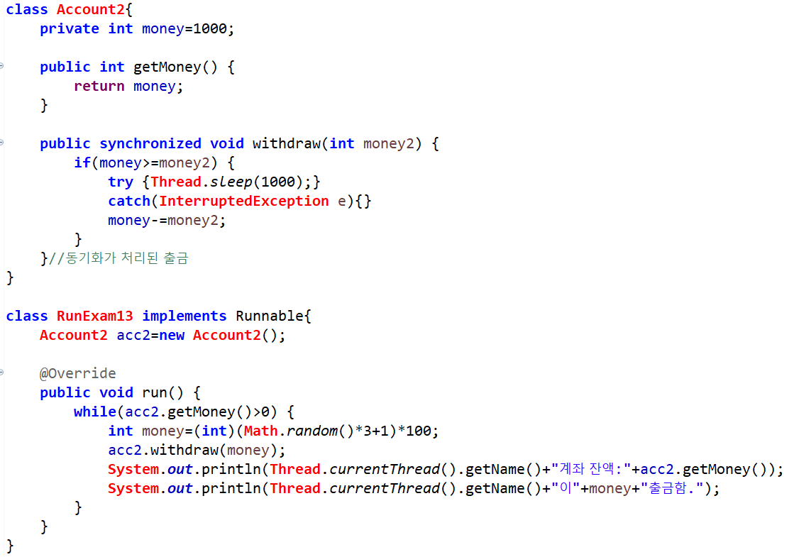 이전 예제에서 출금 메소드에 synchronized를 붙였다. 동기화를 했기 때문에 음수값이 나오지 않는다. 여기서 money는 private여야 외부에서 직접 접근할 수 없다.