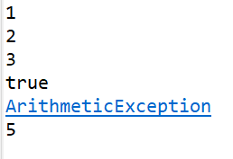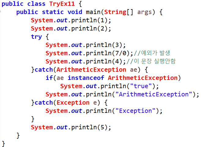 마지막 catch(Exception e)는 ArithmeticException을 제외한 모든 예외가 처리된다. 해당 예제는 7/0에서 예외가 발생하므로 ArithmeticException이 발생해 true와 ArithmeticException가 출력된다.