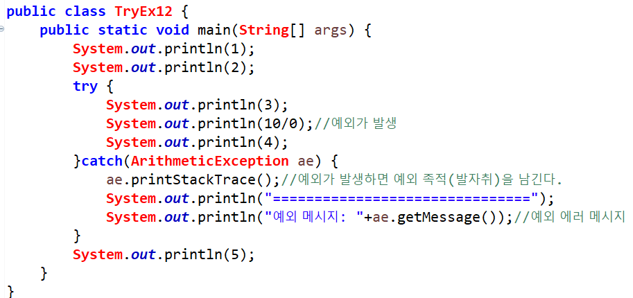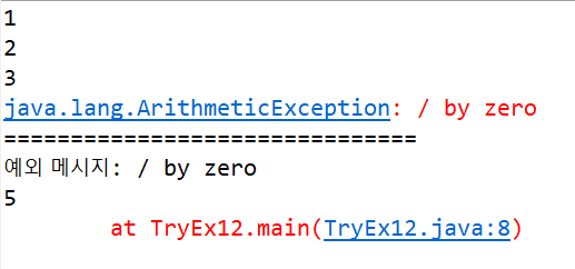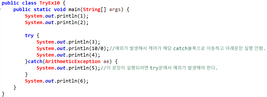 try문에서 3까지 출력이 되고, 10/0에서 예외가 발생하므로 아래의 4는 출력되지 않고 catch문으로 가 5를 출력하게 되고, 다음 catch문을 빠져나와 6을 출력하게 된다.