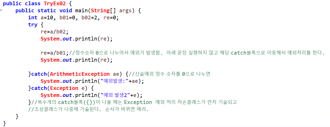 하나의 try블럭 다음에는 여러 종류의 예외를 처리할 수 있도록 하나 이상의 catch블록이 올 수 있으며, 이 중 발생한 예외의 종류와 일치하는 단 한개의 catch블럭만 수행된다. 여러개의 catch블록을 기술할 때는 자손클래스가 먼저 기술되고, 조상클래스가 나중에 기술된다.