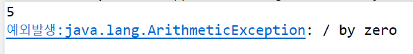 10/2에서는 5로 문제가 없지만 10/0에서는 정수숫자 0으로 나누어서 예외가 발생된다. 해당 예외는 ArithmeticException catch 블록이 실행된다.