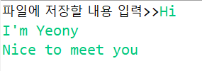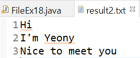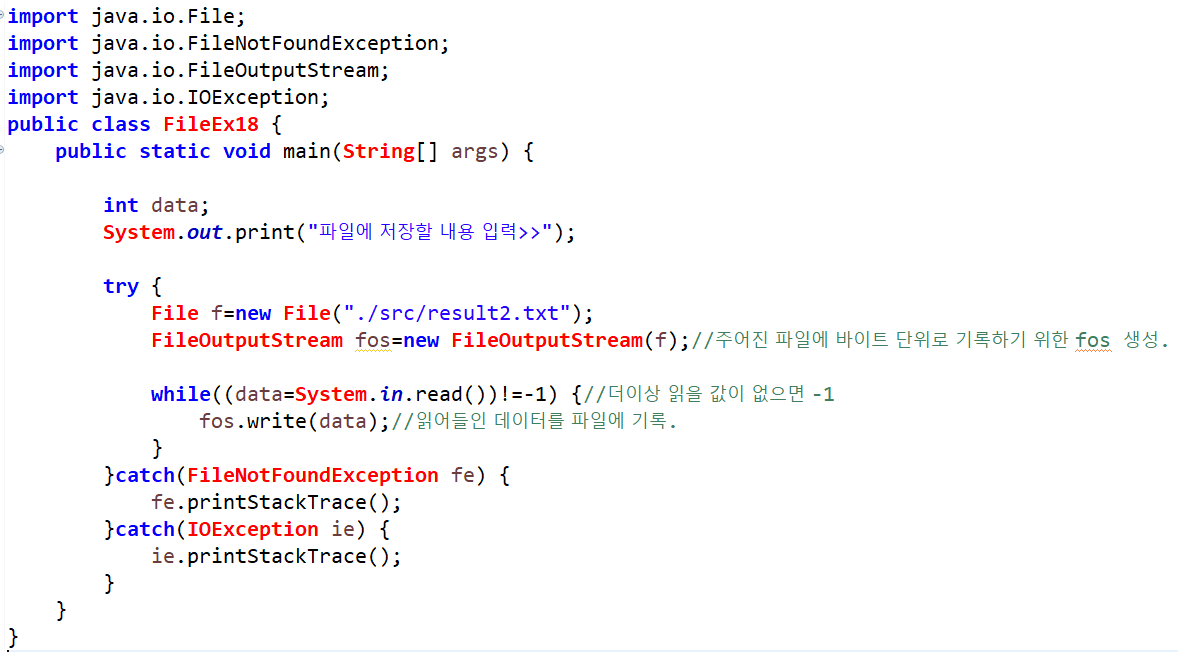 해당 코드는 File 타입 참조변수 f에 경로를 대입한 생성자로 초기화한다. 그리고 FileOutputStream타입 참조변수 fos에 참조변수 f를 생성자 매개변수로 넣어 초기화한다. 이 과정은 주어진 파일에 바이트 단위로 기록하기 위한 것이다. data변수에 read()를 대입하고 입력된 값들을 fos.write(data)로 출력하며, 더 이상 입력되는 값이 없으면 -1이 반환되어 무한 반복문을 종료한다. 파일에 저장할 내용을 입력하면 result2.txt파일에 내용이 저장된다.