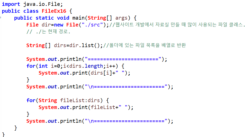 해당 코드는 파일 경로로 생성자를 호출하고, dirs 배열에 dir.list()를 저장해 폴더에 있는 파일목록을 배열에 저장한다.