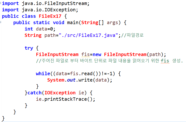 해당 코드는 FileInputStream 타입 fis참조변수에 path를 대입한 생성자로 초기화한다. data변수에 fis.read()를 대입하고 입력된 값들을 write(data)로 출력하며, 더 이상 입력되는 값이 없으면 -1이 반환되어 무한 반복문을 종료한다. 출력되는 값들은 해당 코드가 출력된다.