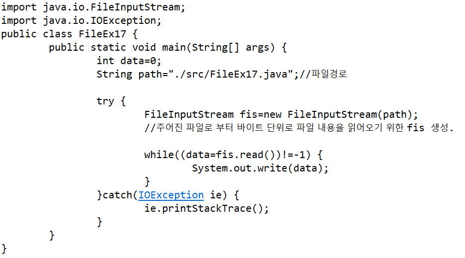 해당 코드는 FileInputStream 타입 fis참조변수에 path를 대입한 생성자로 초기화한다. data변수에 fis.read()를 대입하고 입력된 값들을 write(data)로 출력하며, 더 이상 입력되는 값이 없으면 -1이 반환되어 무한 반복문을 종료한다. 출력되는 값들은 해당 코드가 출력된다.