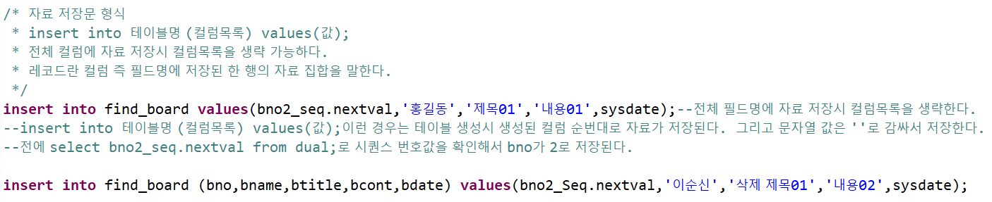 첫 번째 insert문은 전체 필드명에 자료를 저장하기 때문에 (컬럼목록)을 생략했다. 그리고 게시판 번호값은 아까 생성했던 시퀀스로 저장한다. 번호를 select하고 insert하면 계속 값이 바뀐다. sysdate는 오라클 날짜함수이다.