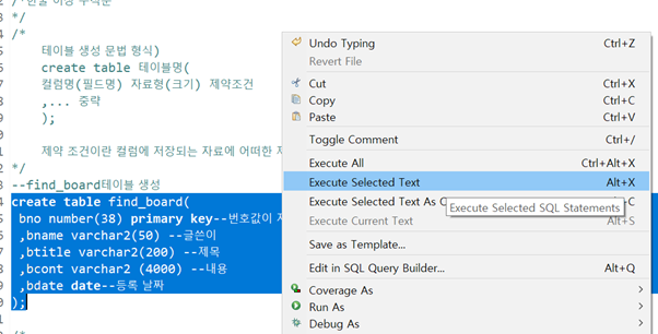여기서 해당 SQL문을 실행하려면, 실행할 SQL문을 블록으로 잡고, 오른쪽 클릭 - Excute Selected Text를 눌러주면 된다. 빠른키는 alt+x이다.
