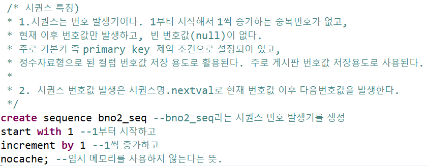테이블에 값을 넣기 전에, 시퀀스를 생성한다. 시퀀스는 번호 발생기로, 빈 번호값(null)이 없다. 주로 기본키 제약조건으로 설정되어 있고, 게시판 번호값 저장용도로 사용된다.