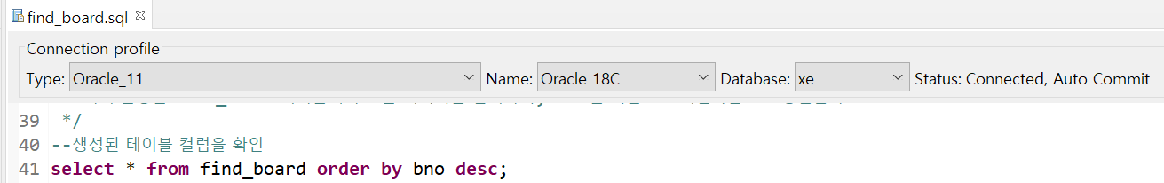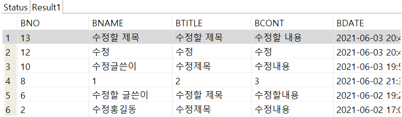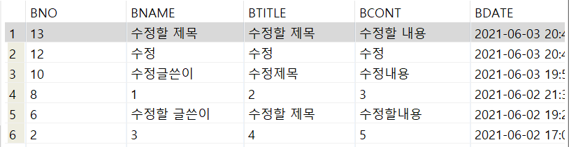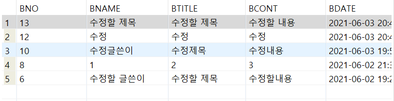 첫 번째 select문을 실행하면 모든 항목들을 bno가 내림차순인 상태로 정렬해서 보여준다.