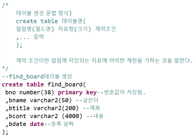 <테이블 생성 create문>
