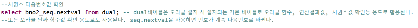시퀀스 다음 번호값을 확인하기 위해 위의 명령어를 사용한다. dual테이블은 오라클 설치 시 설치되는 기본 테이블이다. seq.nextval을 사용하면 번호가 계속 다음번호로 바뀐다.