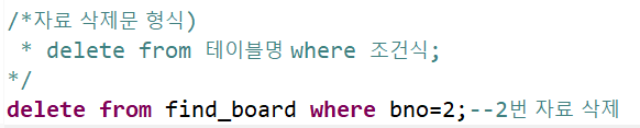 자료를 삭제하고 싶으면 delete from 테이블명 where 조건식; 명령어로 삭제할 수 있다. 해당 delete문은 2번자료를 삭제하는 명령어이다.