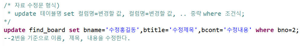 insert를 잘못한 자료를 수정하려면 update문으로 수정 가능하다. update 테이블명 set 컬럼명=변경할 값, ..., where 조건식; 명령어로 사용 가능하며, 위의 update문은 2번을 기준으로 수정을 한다.