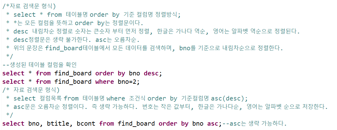테이블 및 값 확인을 위해서 select문으로 검색할 수 있다. select *(또는 컬럼지정) from 테이블명 order by 기준컬럼명 정렬방식; 명령어로 검색할 수 있다. *로 모든 항목을 검색하거나, 특정 컬럼명을 지정해서 확인할 수 있다. 정렬방식은 오름차순(asc) 및 내림차순(desc)이 있다. default값이 asc이기 때문에 내림차순으로 정렬하려면 꼭 입력해줘야 한다.