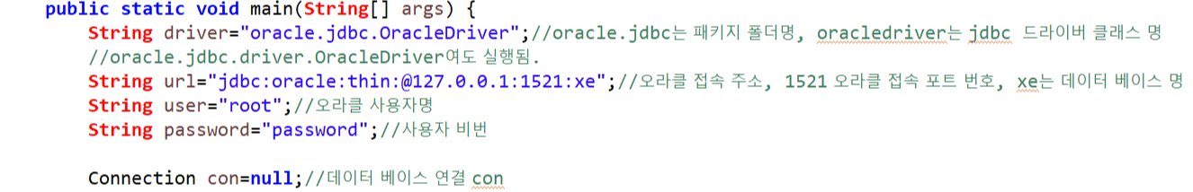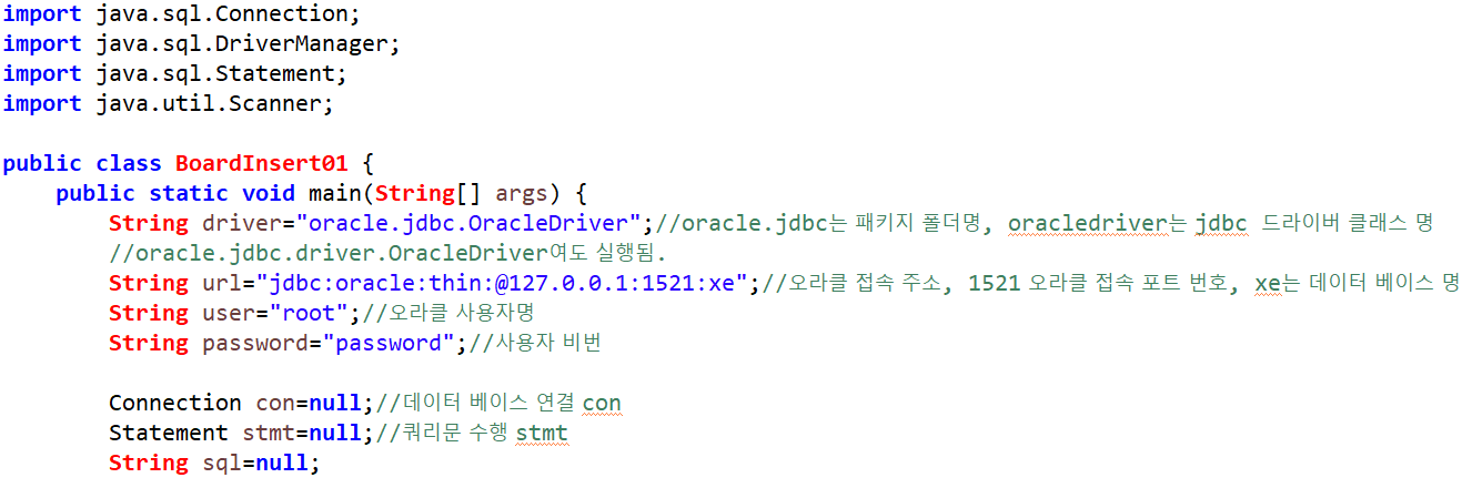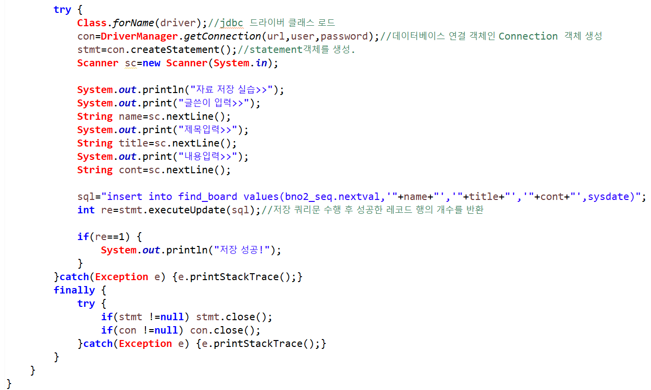 Class.forName()메소드로 jdbc드라이버를 로드하고, DriverManager.getConnection()로 데이터베이스와 연결한다. con.createStatement()로 stmt 객체를 생성하고, SQL문을 생성해 executeUpdate(sql)로 SQL문장을 실행한다.