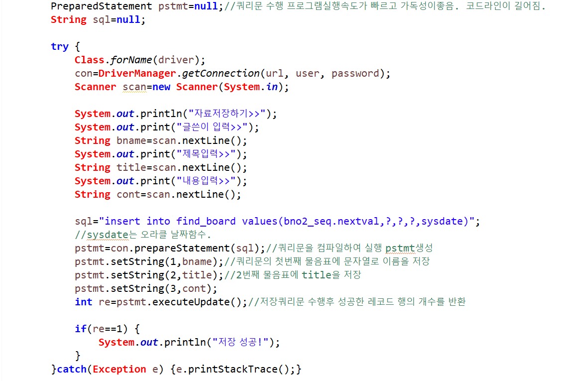 Class.forName()메소드로 jdbc드라이버를 로드하고, DriverManager.getConnection()로 데이터베이스와 연결한다. 여기서 Statement와 다른점은 sql문을 먼저 생성하고 con.prepareStatement(sql);로 쿼리문을 미리 컴파일하여 실행해 pstmt생성한다. 그 후 executeUpdate()를 실행하는데, 해당 메소드는 얼마나 많은 레코드들이 변경되었는지를 반환한다.