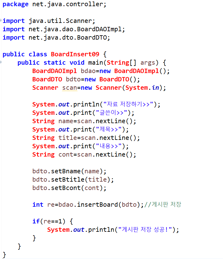 DAO와 DTO를 import 해서 객체를 생성하고, Scanner클래스로 글쓴이, 제목, 내용들을 각 DTO에 저장한다. re에 DAO의 insertBoard(bdto)값을 대입해 re==1이면 게시판 저장 성공 문구가 출력된다.