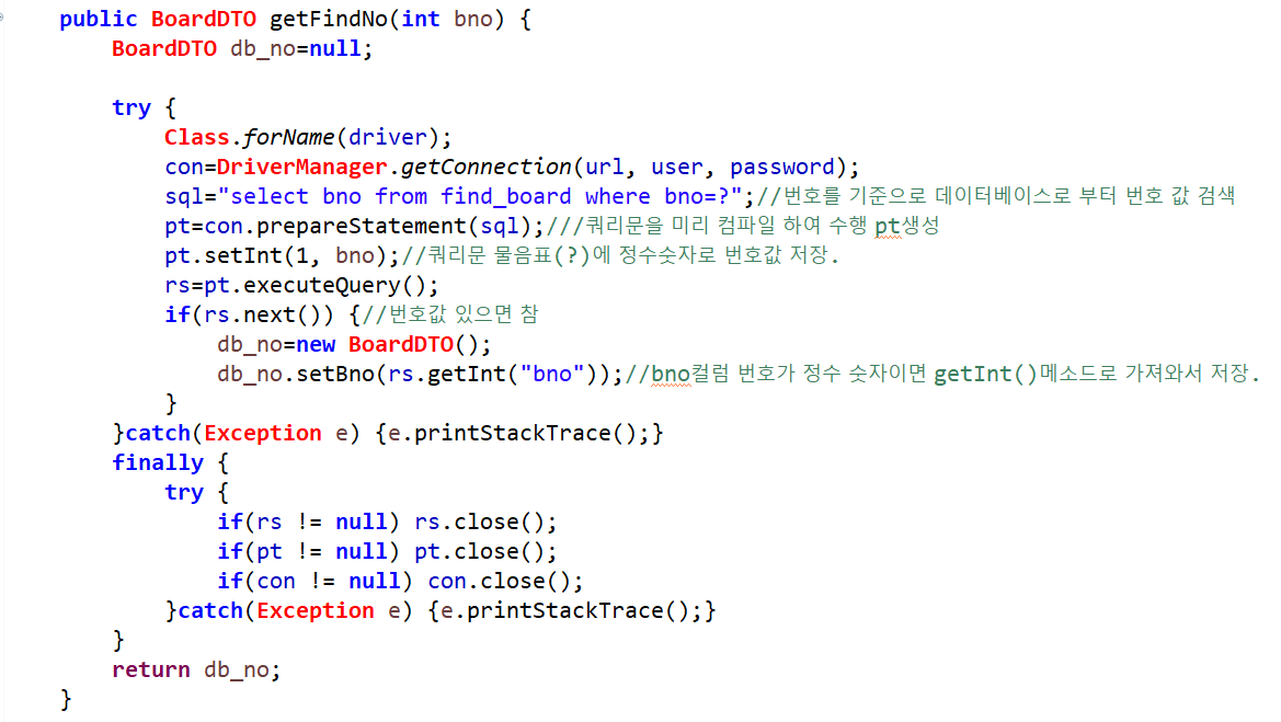 여기서 getFindNo메소드에 Scanner클래스에서 입력받은 bno가 매개변수로 들어온다. db_no를 null값으로 미리 초기화 시키고(검색 실패 시 null값 반환), try문에 의해 jdbc 드라이버 클래스가 로드되며, 데이터베이스와 연결한다. sql문을 생성하고, 쿼리문을 미리 컴파일하여 수행 후 pt객체를 생성한다. 쿼리문 물음표(?)에 정수숫자로 번호값을 저장해주고, executeQuery()로 SQL문장을 실행한다. if조건문에 의해 번호가 있으면 참으로, db_no에 새로운 객체주소를 저장한 후, setter메소드로 검색된 번호값을 저장한다. finally로 생성된 rs, pt, con을 닫아준다. 마지막으로 db_no를 반환해준다.