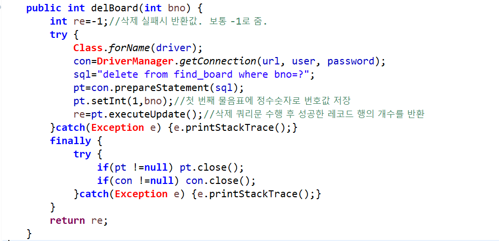 delBoard메소드에는 Scanner로 입력받은 bno가 매개변수가 들어온다. 저장이 실패되면 re=-1이 반환되며, try문에 의해 jdbc 드라이버 클래스가 로드되며, 데이터베이스와 연결한다. sql문을 생성하고, 쿼리문을 미리 컴파일하여 수행 후 pt객체를 생성한다. 쿼리문 물음표(?)에 번호값, 변수를 지정해준 후 executeUpdate()로 SQL문장을 실행한다. re에 성공한 레코드 행의 개수를 저장하며, finally로 생성된 pt와 con을 닫아준다. 마지막으로 re를 반환해준다.