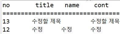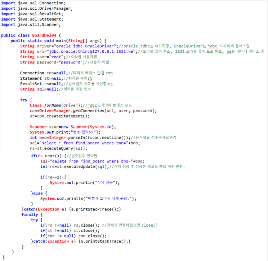 delBoard메소드에는 Scanner로 입력받은 bno가 매개변수가 들어온다. 저장이 실패되면 re=-1이 반환되며, try문에 의해 jdbc 드라이버 클래스가 로드되며, 데이터베이스와 연결한다. sql문을 생성하고, 쿼리문을 미리 컴파일하여 수행 후 pt객체를 생성한다. 쿼리문 물음표(?)에 번호값, 변수를 지정해준 후 executeUpdate()로 SQL문장을 실행한다. re에 성공한 레코드 행의 개수를 저장하며, finally로 생성된 pt와 con을 닫아준다. 마지막으로 re를 반환해준다.