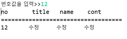 여기서 getFindNo메소드에 Scanner클래스에서 입력받은 bno가 매개변수로 들어온다. db_no를 null값으로 미리 초기화 시키고(검색 실패 시 null값 반환), try문에 의해 jdbc 드라이버 클래스가 로드되며, 데이터베이스와 연결한다. sql문을 생성하고, 쿼리문을 미리 컴파일하여 수행 후 pt객체를 생성한다. 쿼리문 물음표(?)에 정수숫자로 번호값을 저장해주고, executeQuery()로 SQL문장을 실행한다. if조건문에 의해 번호가 있으면 참으로, db_no에 새로운 객체주소를 저장한 후, setter메소드로 검색된 번호값을 저장한다. finally로 생성된 rs, pt, con을 닫아준다. 마지막으로 db_no를 반환해준다.