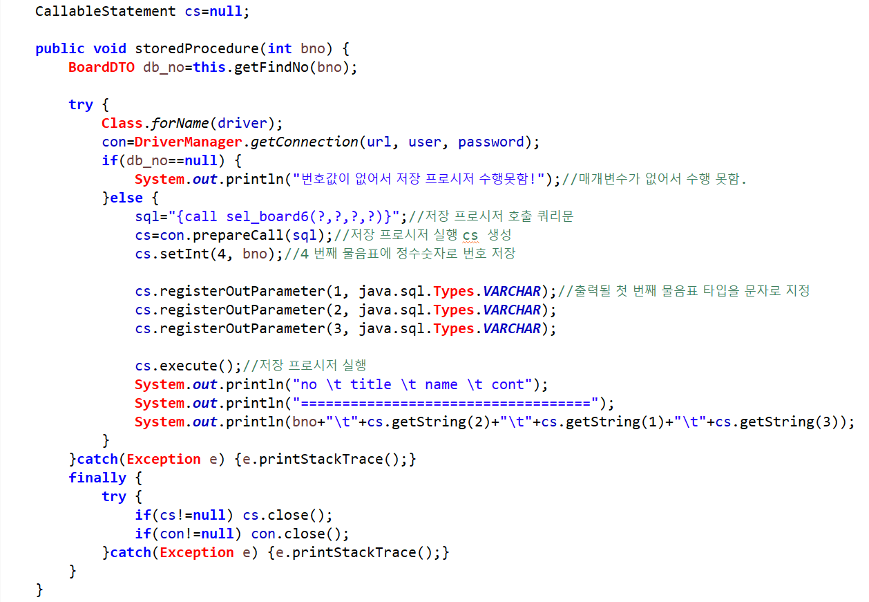 storedProcedure메소드에는 Scanner클래스에서 입력한 bno가 매개변수로 들어온다. DTO타입의 db_no참조변수에 getFindNo(bno)주소가 저장되며, try문에 의해 jdbc 드라이버 클래스가 로드되고 데이터베이스와 연결된다. if 조건문에 db_no가 null이면 저장 프로시저 수행을 못하며, null이 아니면 sql에 저장 프로시저 호출 쿼리문을 저장하고, 저장 프로시저를 실행하는 cs객체를 생성한다. SQL파일에서 bno는 in매개변수로 되어있기 때문에 setInt로 정수숫자로 번호를 저장한다. 그 외 변수들은 out매개변수로 되어있기 때문에 registerOutParameter()메소드를 사용한다.