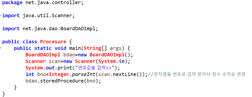 DAO를 import 해서 객체를 생성하고, Scanner클래스로 번호값을 입력 받아 bno에 저장한다. bdao.storedProcedure(bno)메소드를 실행하면, 저장 프로시저가 실행되며 번호값에 해당하는 레코드를 출력한다.